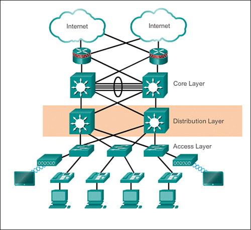 Lớp Distribution phải xác định cho được con đường nhanh nhất đáp ứng các yêu cầu của User và sau khi xác định được con đường nhanh nhất, nó gửi các yêu cầu đến lớp Core. Lớp Core chịu trách nhiệm chuyển mạch các yêu cầu đến đúng dịch vụ cần thiết. Lớp Distribution là nơi thực hiện các chính sách (Policies) cho mạng, cung cấp tập hợp các tuyến đường đến mạng Core. Trong phạm vi mạng LAN, lớp Distribution cung cấp định tuyến giữa các VLAN, bảo mật và QoS.