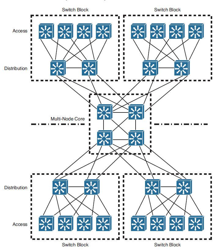 Kiến trúc Multi-Node Core với các Switch Core được gom thành một cụm, mỗi Switch core vừa HA vừa quản lý 2 cụm Switch Block (Distribution, Access)
